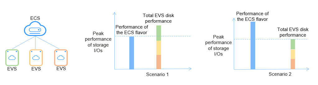 Scenario 1: If the total performance of EVS disks on an instance exceeds the storage I/O capabilities of the instance flavor, the instance flavor's storage I/O capabilities are used. If the instance has multiple EVS disks, the storage I/O performance is dynamically allocated to the EVS disks based on a contention mechanism.