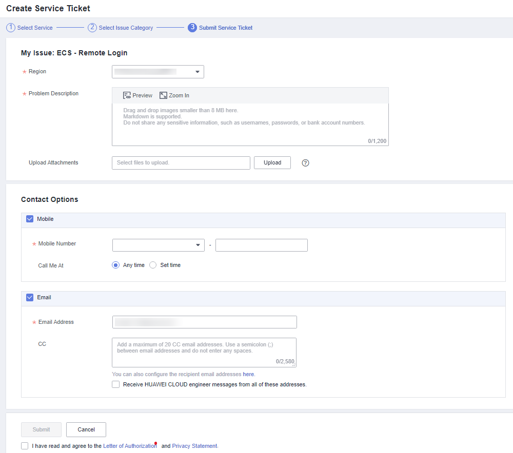 - On the Submit Service Ticket page, select a region, enter the problem description, and upload files (optional).