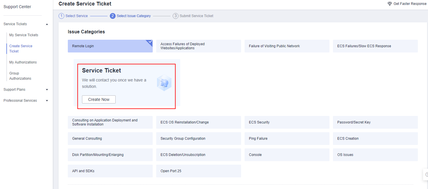 - Select an issue category. In the Service Ticket area, click Create Now.Figure 2 Creating a service ticket