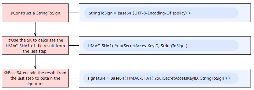 Signature = Base64( HMAC-SHA1( Your_SK, StringToSign ) ) StringToSign = Base64( UTF-8-Encoding-Of( policy ) )