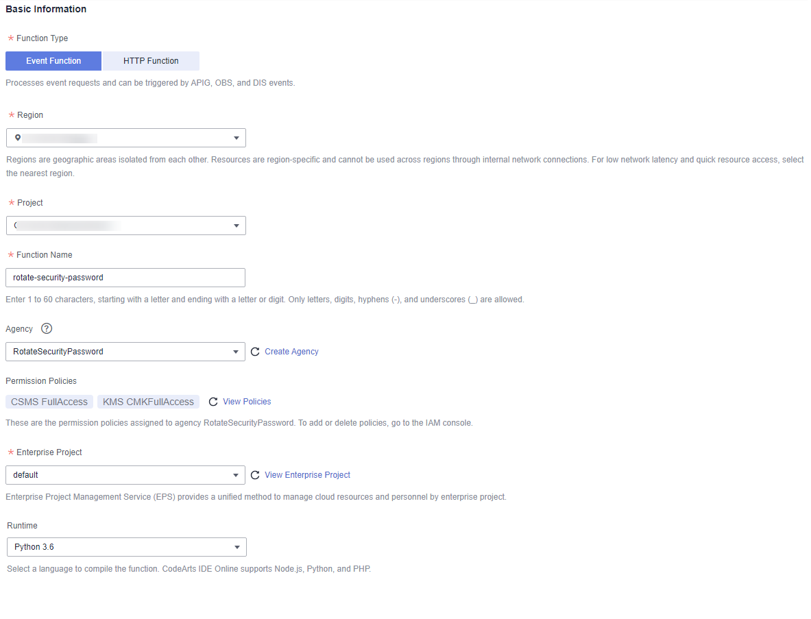 on the left and choose . - Click Create Function in the upper right corner and configure the parameters as shown in Figure 5. Table 2 describes the parameters.