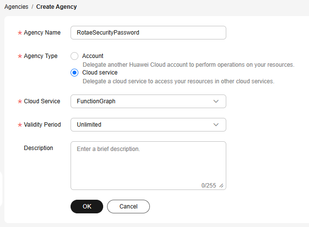 - Click Create Agency and configure the parameters as shown in Figure 2. Table 1 describes the parameters.
