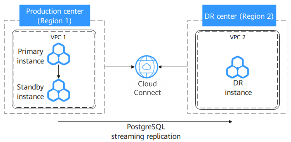 An RDS for PostgreSQL instance is independently deployed in each of two data centers. RDS replicates data from the RDS for PostgreSQL instance in the production center to the RDS for PostgreSQL instance in the DR center, keeping data synchronous across the regions. Before using this function, ensure that Cloud Connect is available and can establish cross-region network connectivity.