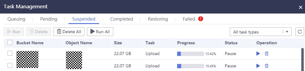 ). Executed tasks will be displayed on the Queuing or Pending tab. - (Optional) Select one or more tasks and click Delete (