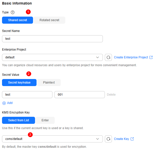 - Before creating a secret, register a Huawei Cloud account and enable Huawei Cloud services. For details, see Signing Up for a HUAWEI ID and Enabling Huawei Cloud Services.