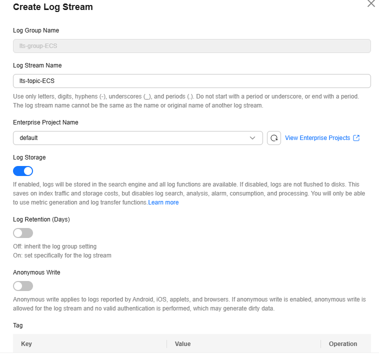 on the left of target log group. - Click Create Log Stream. On the displayed page, set parameters by referring to Table 4.