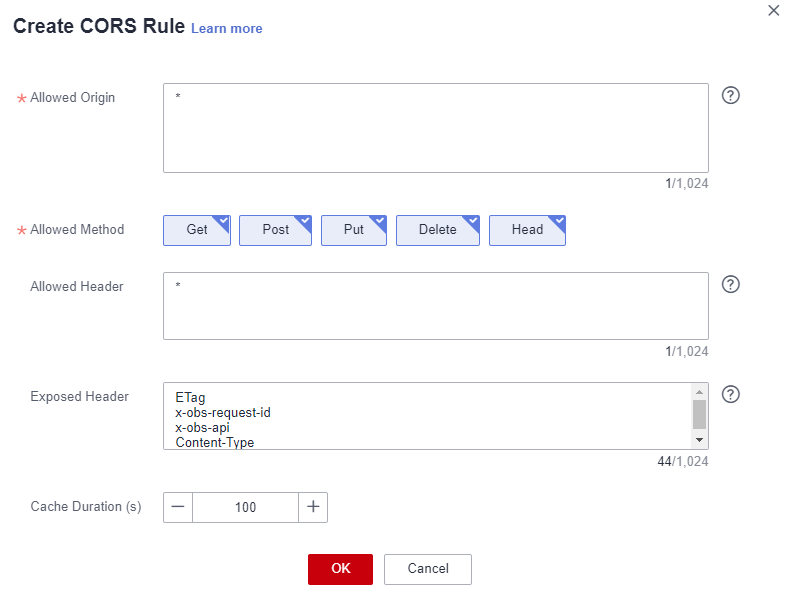 - Click Create. The Create CORS Rule dialog box is displayed. Set the parameters according to the preceding table. See the following figure.