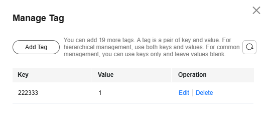- Locate the target instance and click Manage Tag in the Operation column. The Manage Tag dialog box is displayed.