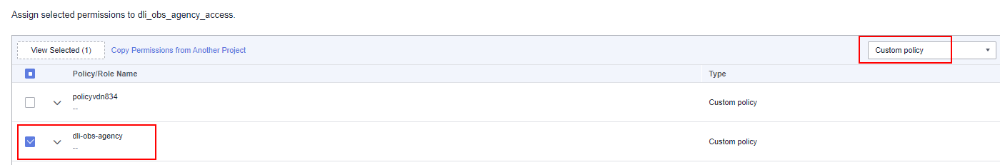 In this example, set it to dli_obs_agency_access.