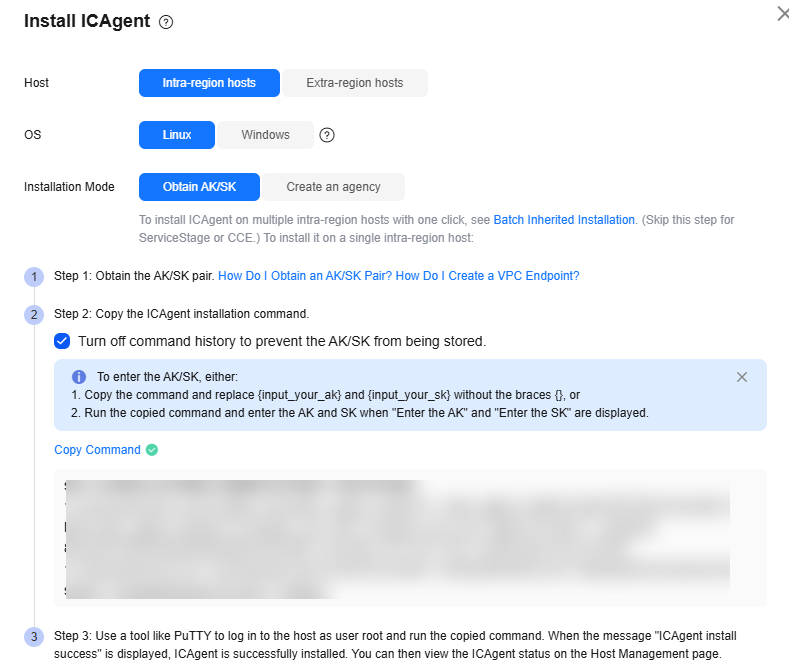 - On the Install ICAgent page, click Copy Command to copy the ICAgent installation command to the local PC and replace the AK/SK in the command with the obtained one.