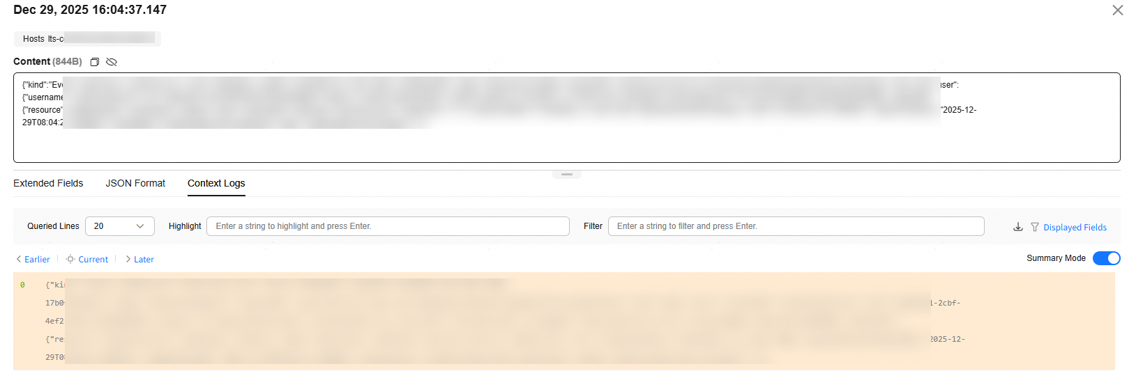 - On the displayed Context Logs page, check the log context. For details, see Table 1.