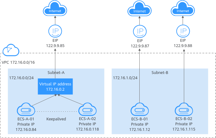 Bind virtual IP address (172.16.0.2) both ECS-A-01 and ECS-A-02. The active/standby switchover of ECS-A-01 and ECS-A-02 can be implemented by using Keepalived. |