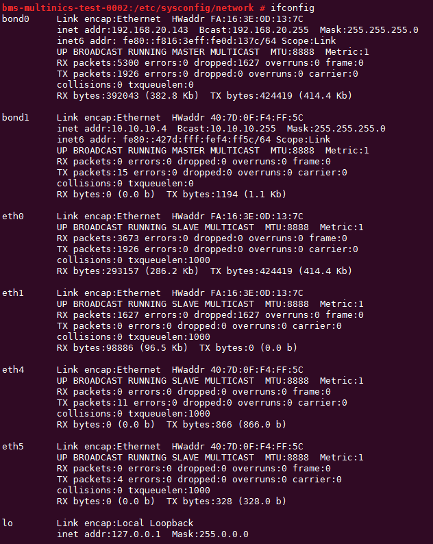 1: lo: <LOOPBACK,UP,LOWER_UP> mtu 16436 qdisc noqueue state UNKNOWN link/loopback 00:00:00:00:00:00 brd 00:00:00:00:00:00 2: eth0: <BROADCAST,MULTICAST,SLAVE,UP,LOWER_UP> mtu 8888 qdisc mq master bond0 state UP qlen 1000 link/ether fa:16:3e:0d:13:7c brd ff:ff:ff:ff:ff:ff 3: eth1: <BROADCAST,MULTICAST,SLAVE,UP,LOWER_UP> mtu 8888 qdisc mq master bond0 state UP qlen 1000 link/ether fa:16:3e:0d:13:7c brd ff:ff:ff:ff:ff:ff 4: eth4: <BROADCAST,MULTICAST> mtu 1500 qdisc noop state DOWN qlen 1000 link/ether 40:7d:0f:f4:ff:5c brd ff:ff:ff:ff:ff:ff 5: eth5: <BROADCAST,MULTICAST> mtu 1500 qdisc noop state DOWN qlen 1000 link/ether 40:7d:0f:f4:ff:5d brd ff:ff:ff:ff:ff:ff 6: bond0: <BROADCAST,MULTICAST,MASTER,UP,LOWER_UP> mtu 8888 qdisc noqueue state UP link/ether fa:16:3e:0d:13:7c brd ff:ff:ff:ff:ff:ff