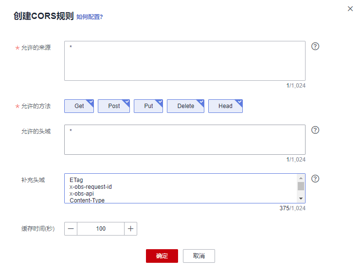 - 在“CORS规则”界面,单击“创建”,系统弹出“创建CORS规则”对话框,在该对话框中按照上表的参数进行配置,如下图所示: