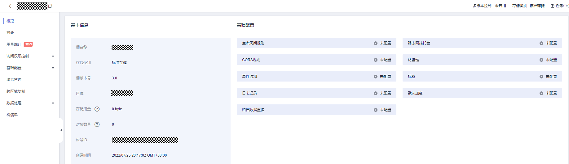- 登录OBS Console后在桶列表中,单击待操作的桶,进入“概览”页面;如下图所示